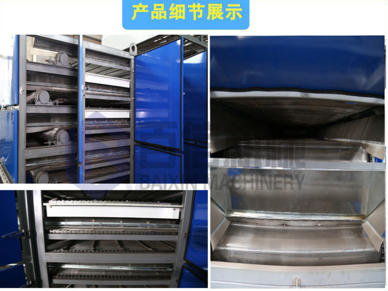 烘室為箱體式,承載物料的網(wǎng)帶為不銹鋼網(wǎng),機(jī)門為鍍鋅鋼板,表面噴漆保護(hù),中間鑲嵌保溫材料。 鏈條為合金鋼套筒滾子鏈,速度兩級設(shè)計,前快后慢,能滿足不同干燥工藝要求。